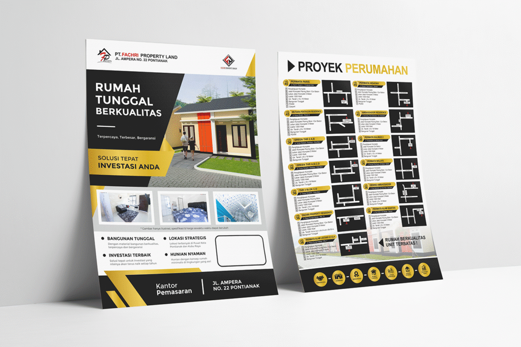 Pembuatan brosur properti sebagai alat pemasaran yang efektif untuk memberikan informasi dan keunggulan produk guna menarik minat calon pembeli dan mempercepat keputusan pembelian.