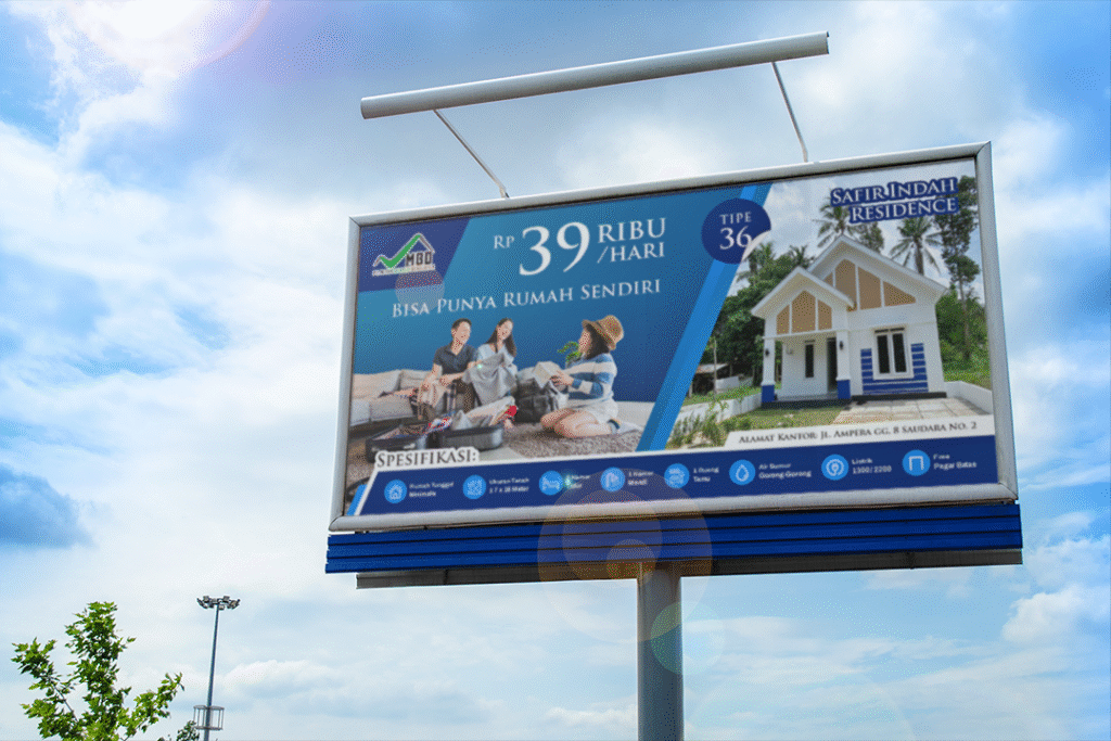 Pembuatan banner properti sebagai media iklan visual yang mencolok untuk mempromosikan properti, menarik perhatian calon pembeli di lokasi, dan membangun brand awareness.